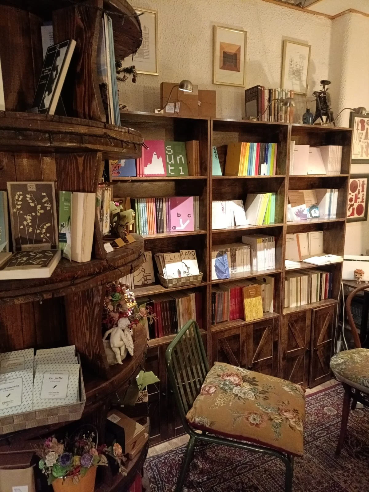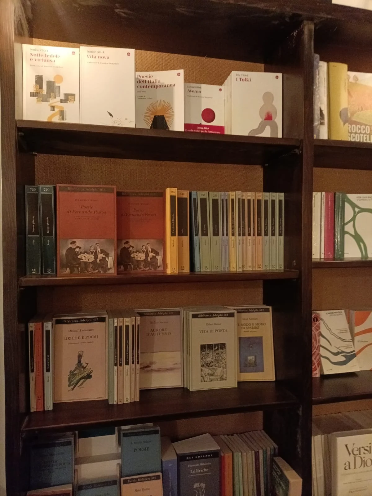 Piccola ma deliziosa: l'unica e sola in Italia, a quanto io sappia, dedicata per intero alla poesia. Libraia molto preparata e brillante, che ho trovato in compagnia della figlia - una ragazzina vulcanica e altrettanto brillante. Ha indovinato che appartengo al segno dei Gemelli - questa cosa dei segni io non la capirò mai - e graziosamente accettato i segnalibri di Banda poetica; ci ho comprato Haiku al femminile uscito per Einaudi a cura di Cristina Banella, Firmamento di Vito M. Bonito uscito con Argolibri; e Per chi non è caduto di Geoffrey Hill pubblicato da luca sossella editore, del quale ho assai apprezzato la raffinata veste grafica.