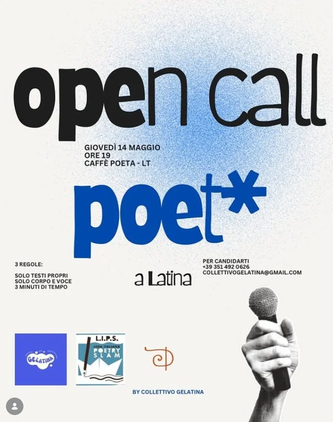 Sarò al Poetry Slam organizzato da Collettivo Gelatina al Caffè Poeta, a Latina, il 14 maggio 2026.